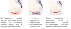 Рисунок 4. Состояние мышц тазового дна до процедуры HIFEM, во время и после процедуры.