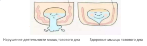 Рисунок 1. Схематическое изображение мышц тазового дна: при нарушении деятельности; здоровые мышцы.