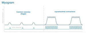 Рисунок №3. Данные миографа: сокращение мышц при выполнении упражнений Кегеля и супермаксимальные сокращения при применении технологии HIFEM.