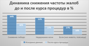 Наиболее часто предъявляемыми жалобами на начало исследования были: снижение либидо (64%), недержание мочи (55%), боли / тяжесть внизу живота, пояснице (27%). Также пациенты предъявляли другие жалобы (36%): сухость влагалища; отсутствие оргазма; проблемы, связанные с сидячим образом жизни; а также состояние после родов.